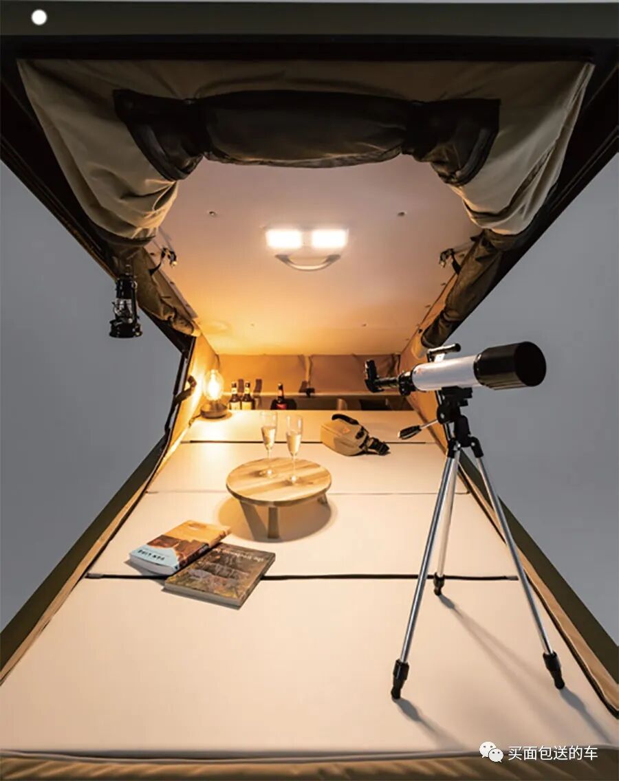 “AMAHO”的亮点在于"Direct Cars”最大限度挖掘了车顶折叠帐篷的尺寸空间,厂家不惜定制了大尺寸的硬顶壳体和外围防水布,车顶帐篷弹出后的高度可达1.3米,从照片上可以看出能在车顶上容下了单个露营桌椅和天文望远镜。