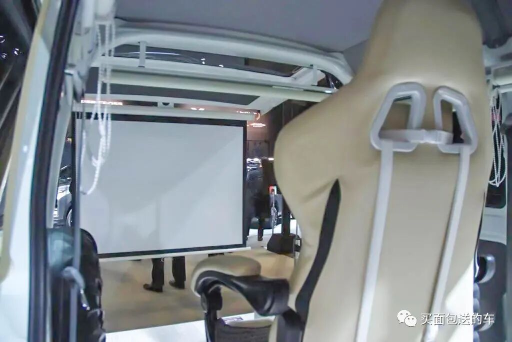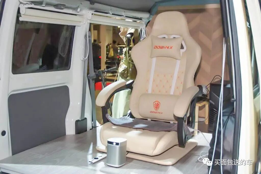 之前简易的折叠沙发更换为电子竞技座椅,投影仪采用移动便携的款式并连接到座椅后方的台式电脑,而车窗上采用卷轴式遮阳帘。