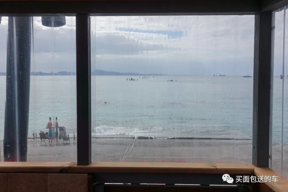 隔着PVC透明面板,可以看到海边的景色,和透明面板上逐渐积累的雾气。