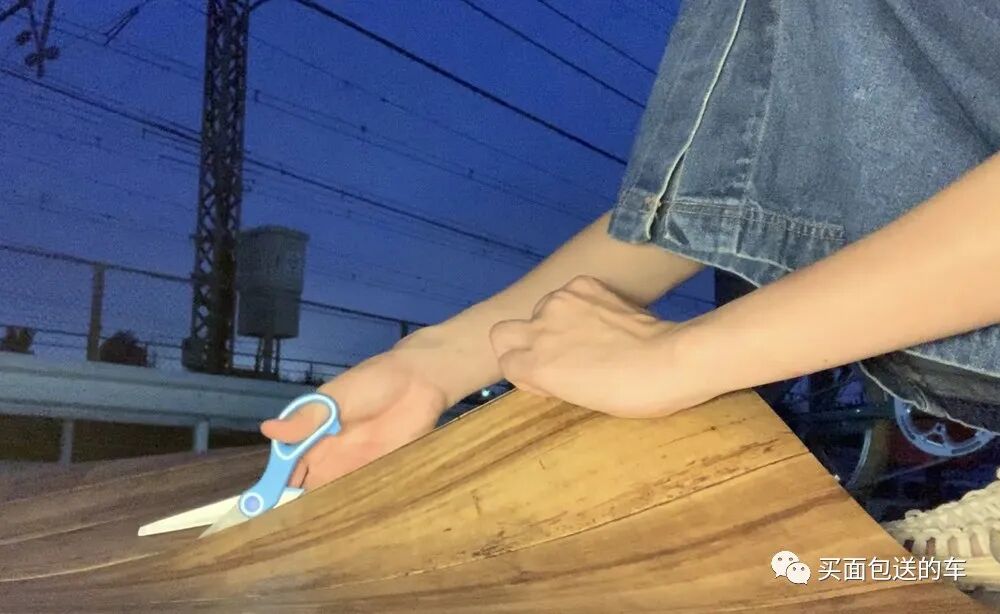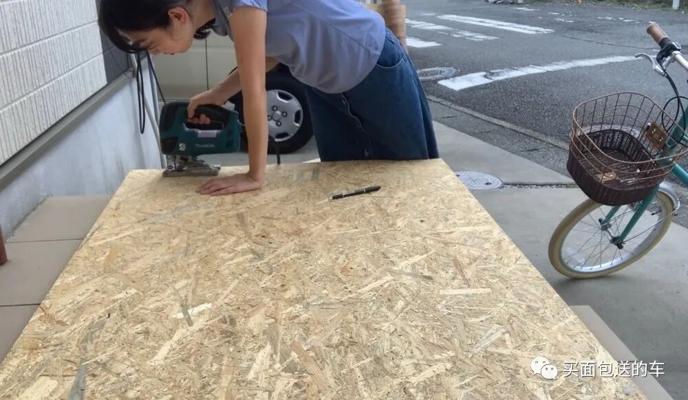 用压缩木屑板切割出和车地板一样的尺寸,(为什么不用实木板?在车内,实木板制作地板容易受潮变形)。