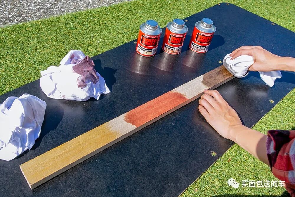 这是WATCO木蜡油涂覆在实木条上的测试效果,用软布蘸少许在木条表面涂覆即可,(小编提示:在国内某宝选择木蜡油时,要区分环保等级,食品级的木蜡油可以用于制作木质餐具,而工业级桐油是带有机溶剂,不可以用于封闭的车内装饰的)。