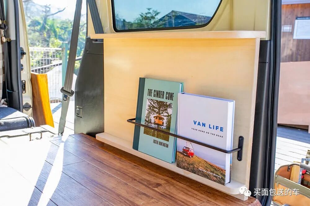 这个桌板用来摆放植物和书籍,让车内看上去有家居的氛围。
