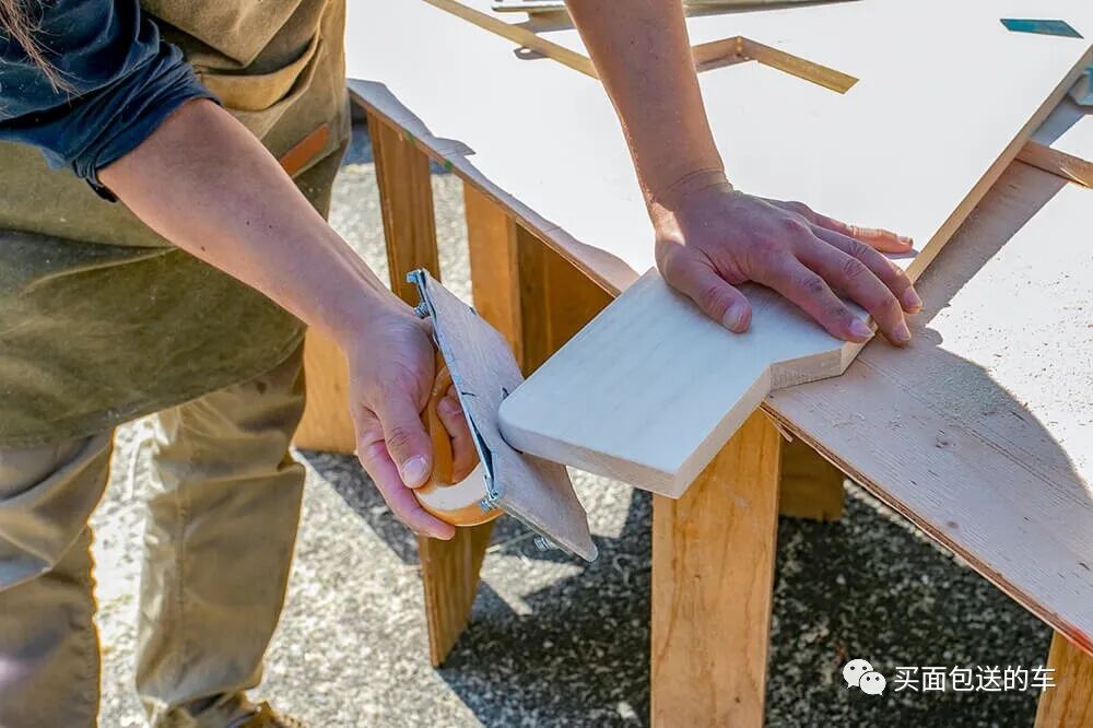 木板的边缘用砂纸打磨做出倒角部分,(为什么不用修边机制作出特定形状?大概是修边机对女孩来说操作很危险吧)。