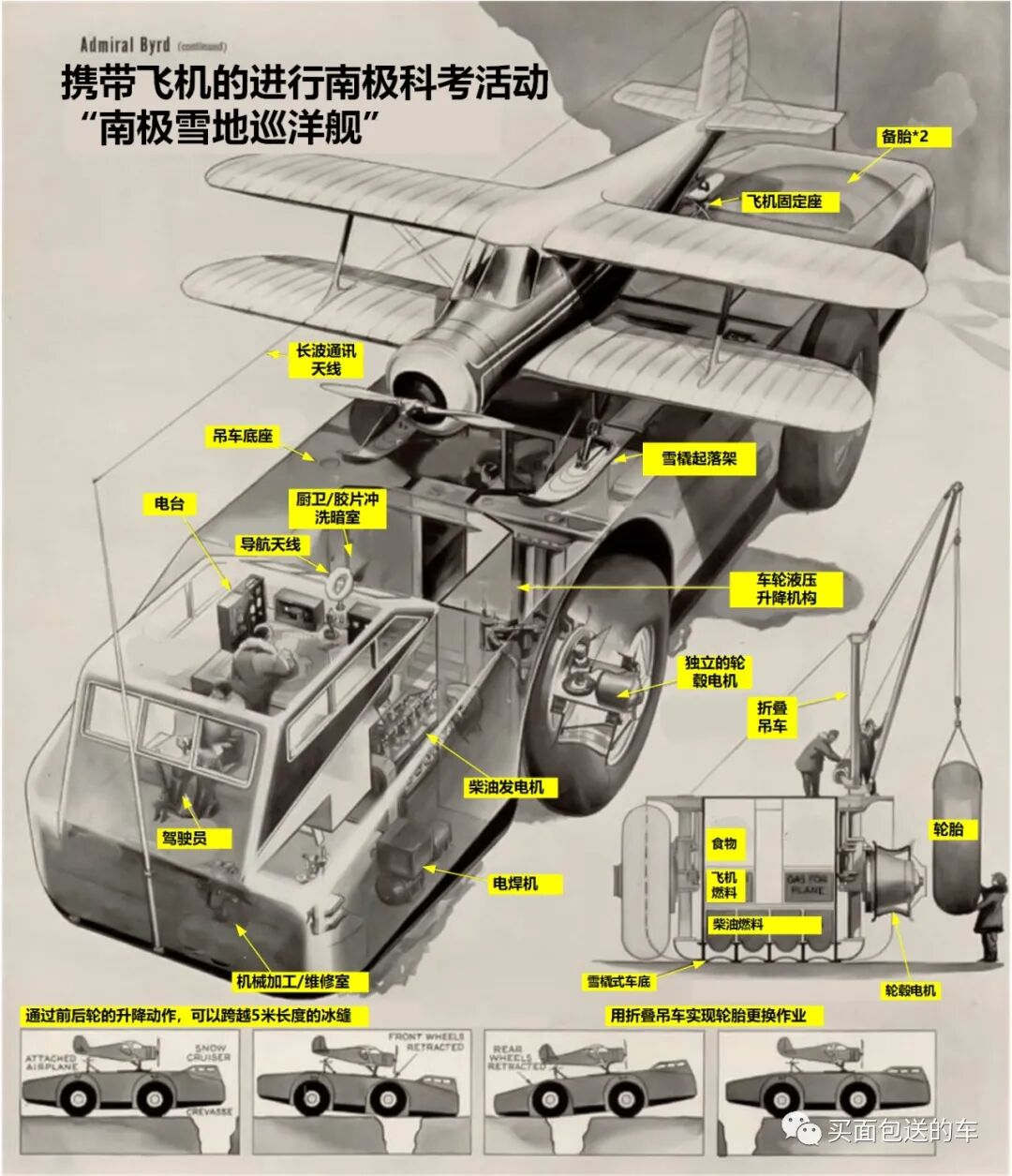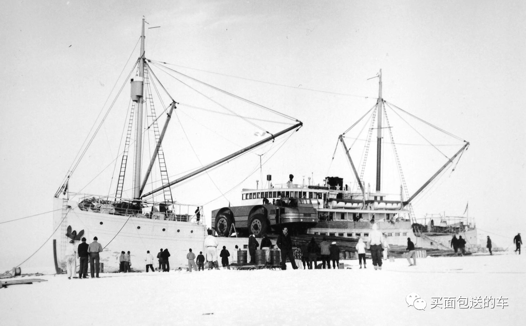 3车顶可携带一架雪橇起落架的双翼飞机,实现航空测绘以及基地与港口之间交通联络