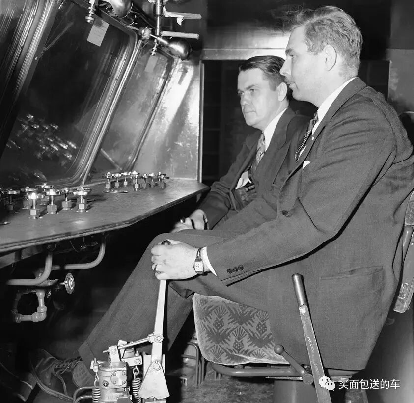 U.S. Antarctic service 首席科学家 F. A. Wade 博士(图右)和 Armour Institute of Technology Research Foundation 装甲研究所技术研究基金会主任 Harold Vagtborg 先生驾驶舱,(注意图片中的复杂液压阀门 在没有现代计算机控制技术的时代,复杂的机械动作需要靠人工按照严谨而复杂的流程来操作各种开关和阀门)。