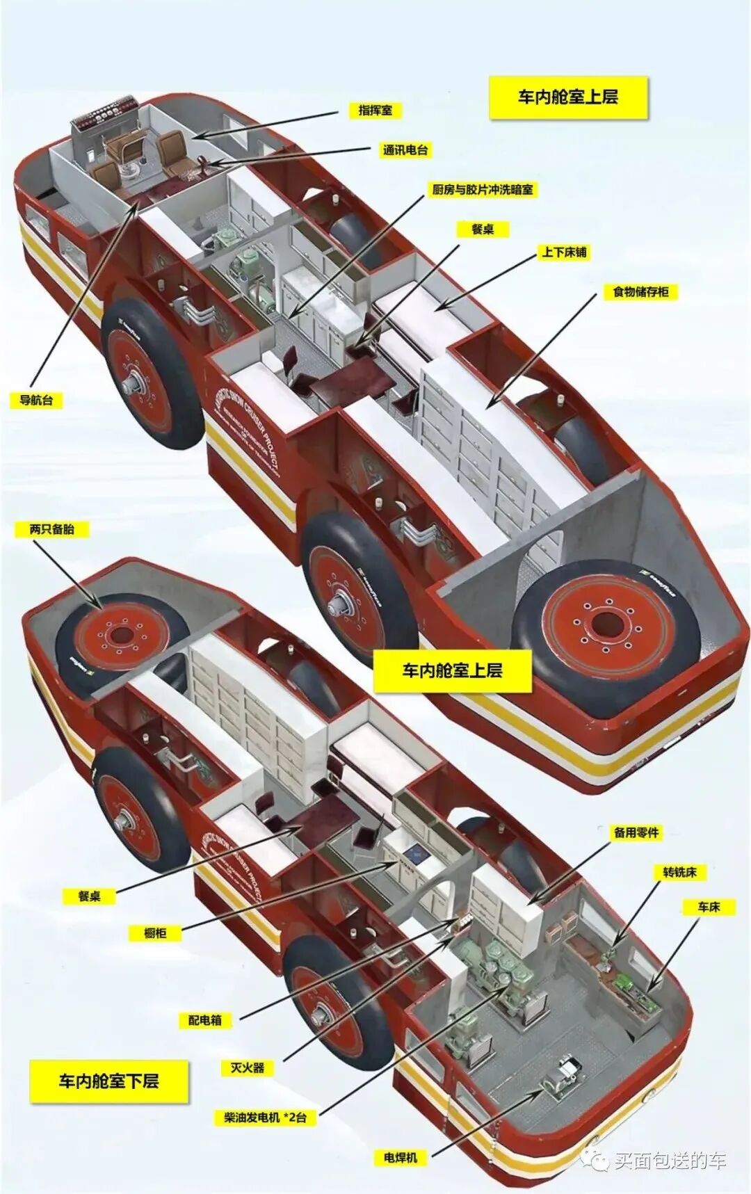 1五人组的乘员可以完全在封闭的车内实现驾驶,居住,洗漱,冲洗胶卷照片,电台通信