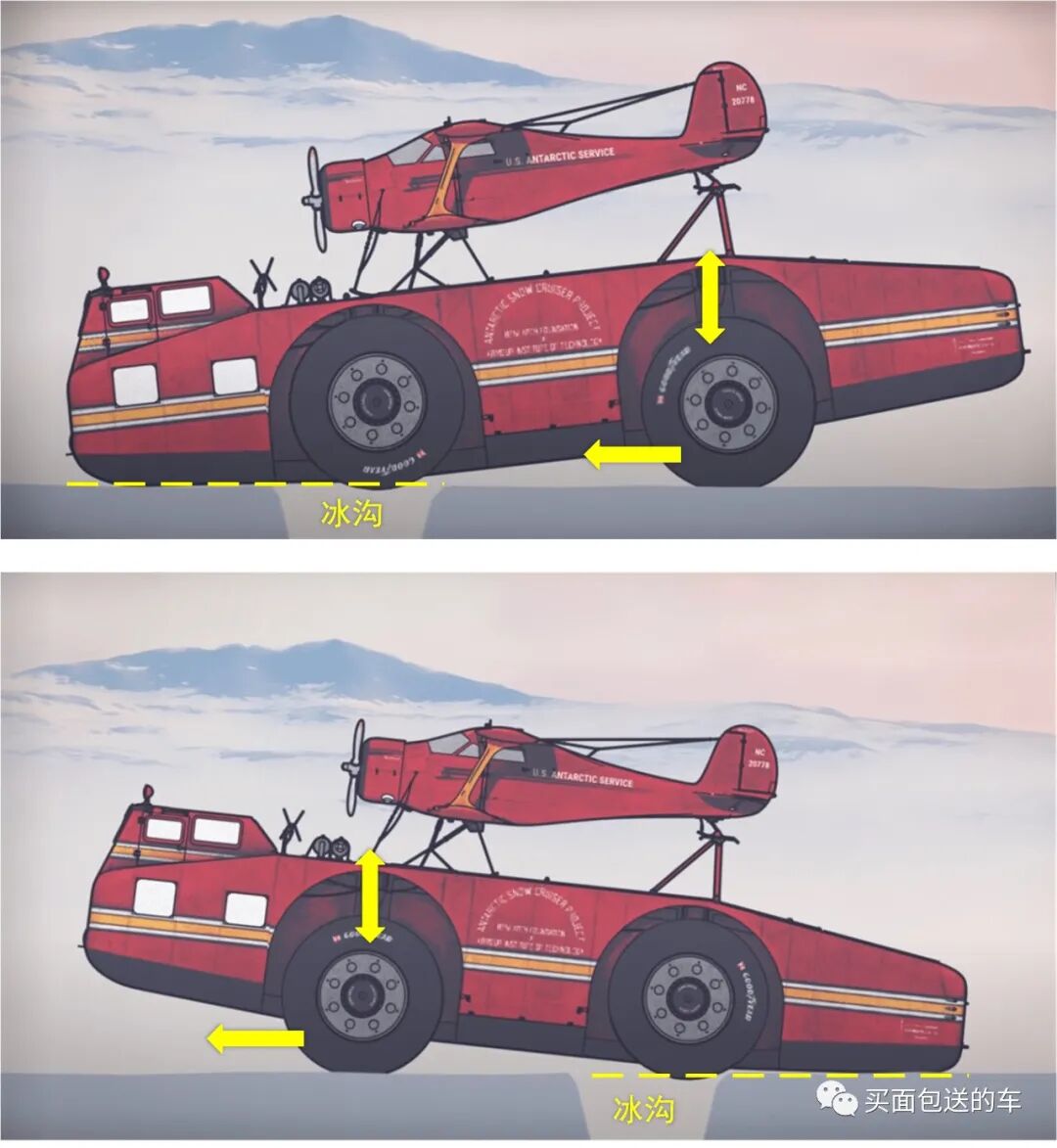通过四个独立控制的车轮悬挂,Antarctic Snow Cruiser利用车头和车尾的雪橇车底形状,就可以如同蠕虫一样跨过近5米长的冰沟。