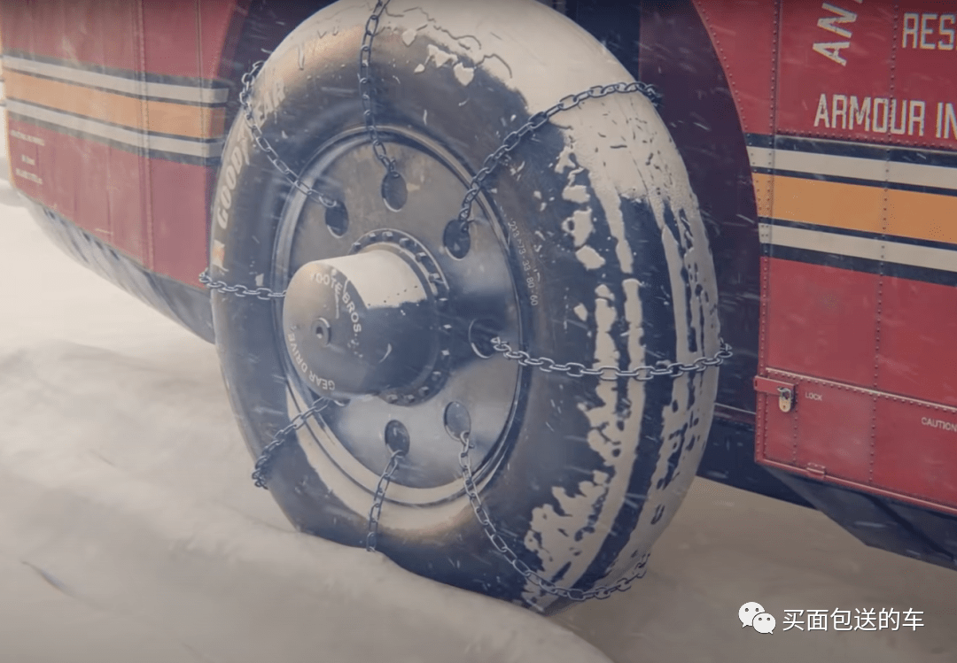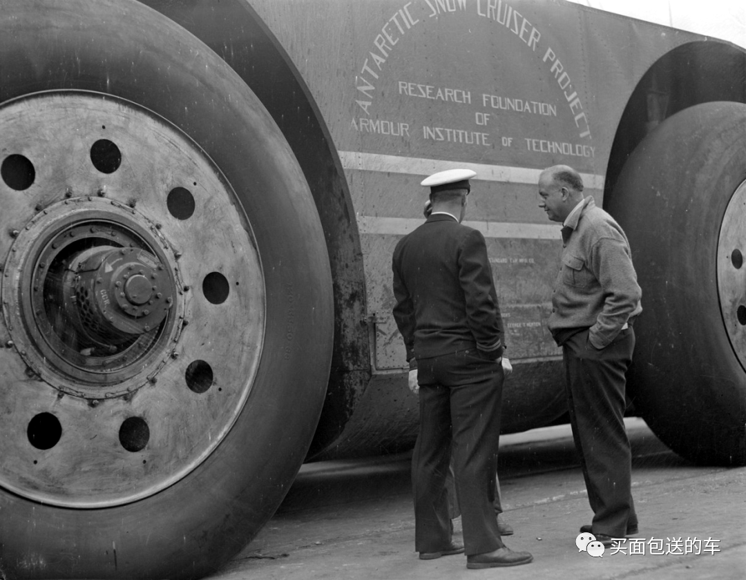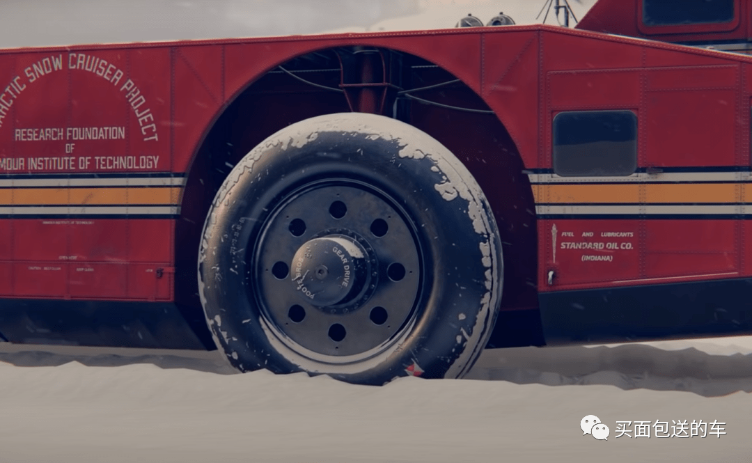 四个外径达到10英寸(2.5米)的橡胶轮子是从农业工程机械上移植过来的GOOD YEAR 固特异轮胎,没有现在AT胎上的防滑纹路,顺便插一句:成立于1898年的美国固特异轮胎是福特汽车的大批量生产T型车的供应商,也是人类工业历史上最早成熟使用硫化橡胶制造汽车轮胎的公司,当时在工程领域依然缺在南极洲的极低温环境下使用橡胶的经验(橡胶在低温下体积会膨胀,和钢制轮毂的热胀冷缩特性会相反),所以Antarctic Snow Cruiser的四轮方案对当时的汽车技术来说是一次创新和冒险。