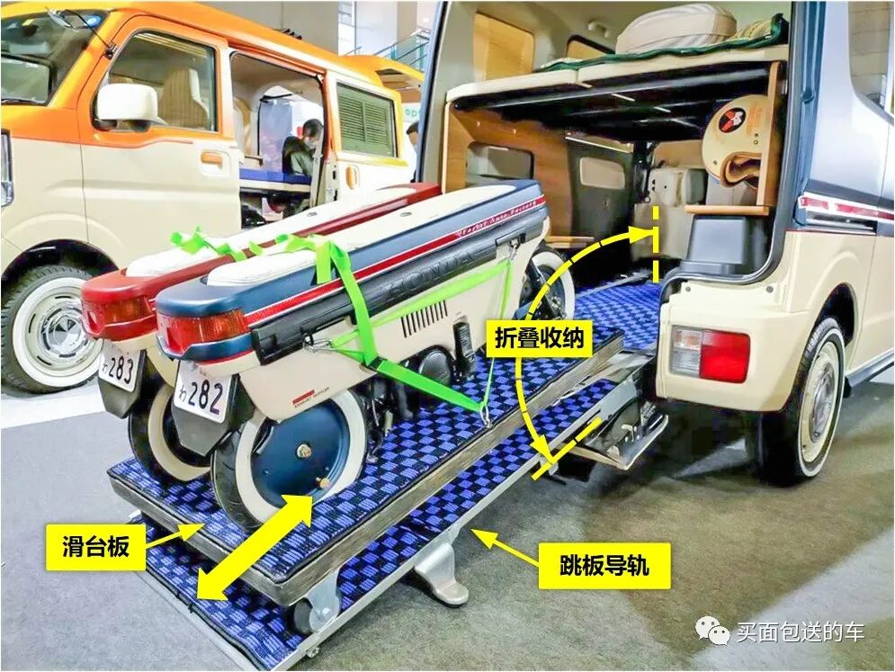 FAF森林汽车工厂对后备箱与保险杠之间进行了切割改装,通过跳板导轨和固定摩托车的滑台实现两台MOTOCOMPO摩托车整体的收纳固定与自卸载。