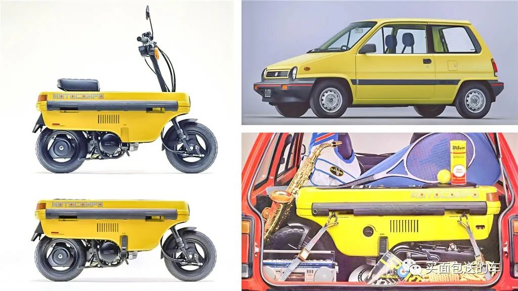1981年发布的本田CITY两厢轿车与本田MOTOCOMPO摩托之间采用后备箱的挂带锚点进行收纳固定,作为本田当年的4+2城市通勤方案,缓解了城市交通堵塞和代步车利用率的问题