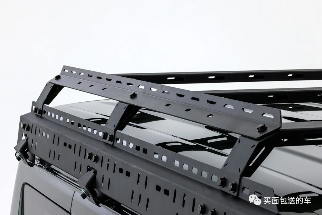 没有了车顶横杆的连接结构,就在在金属挡水条上方通过拓展安装挂板来挂载户外装具和车边帐篷。