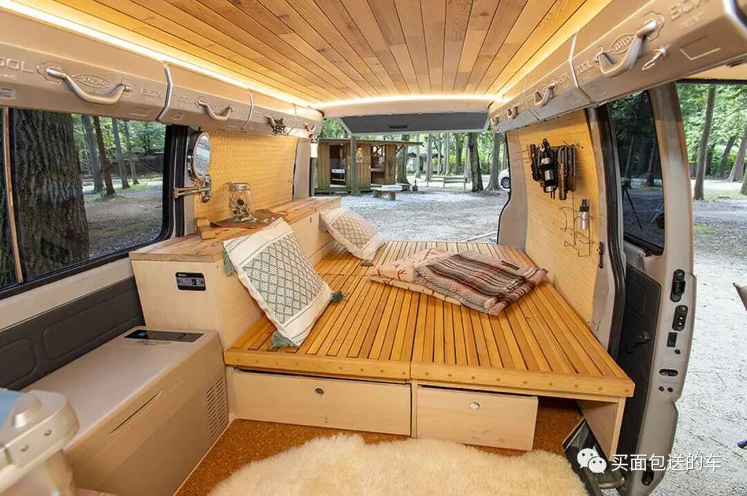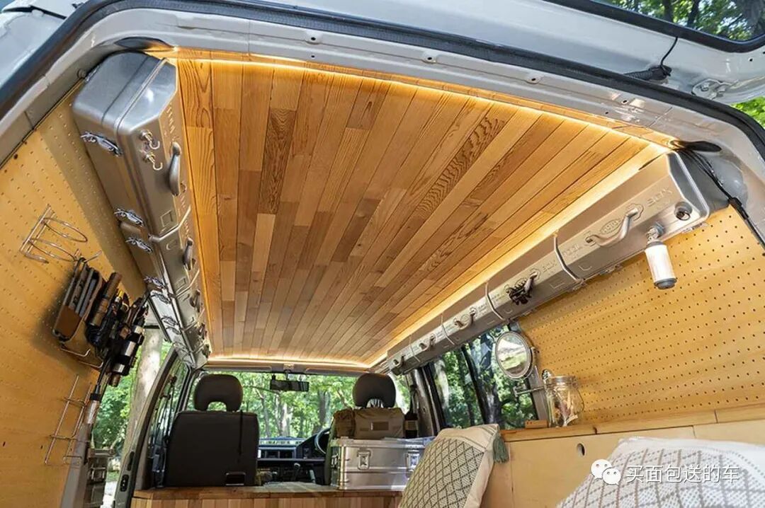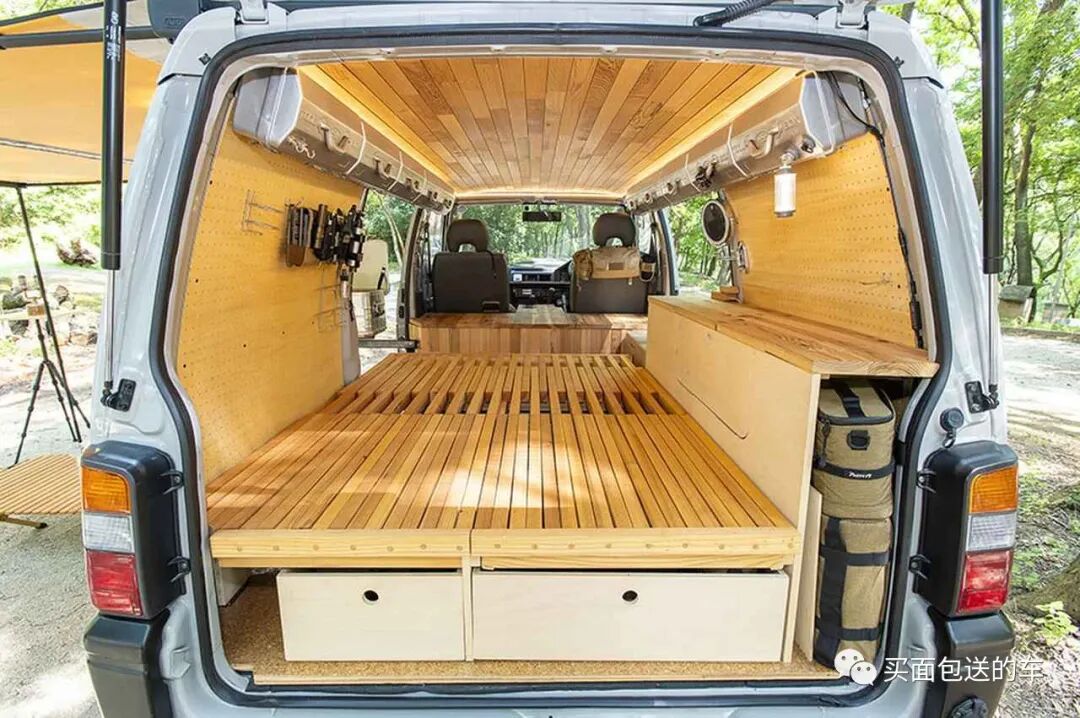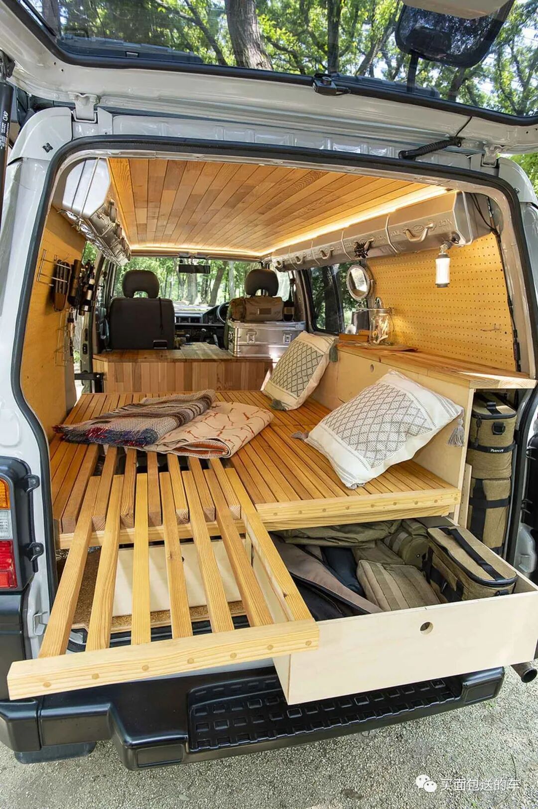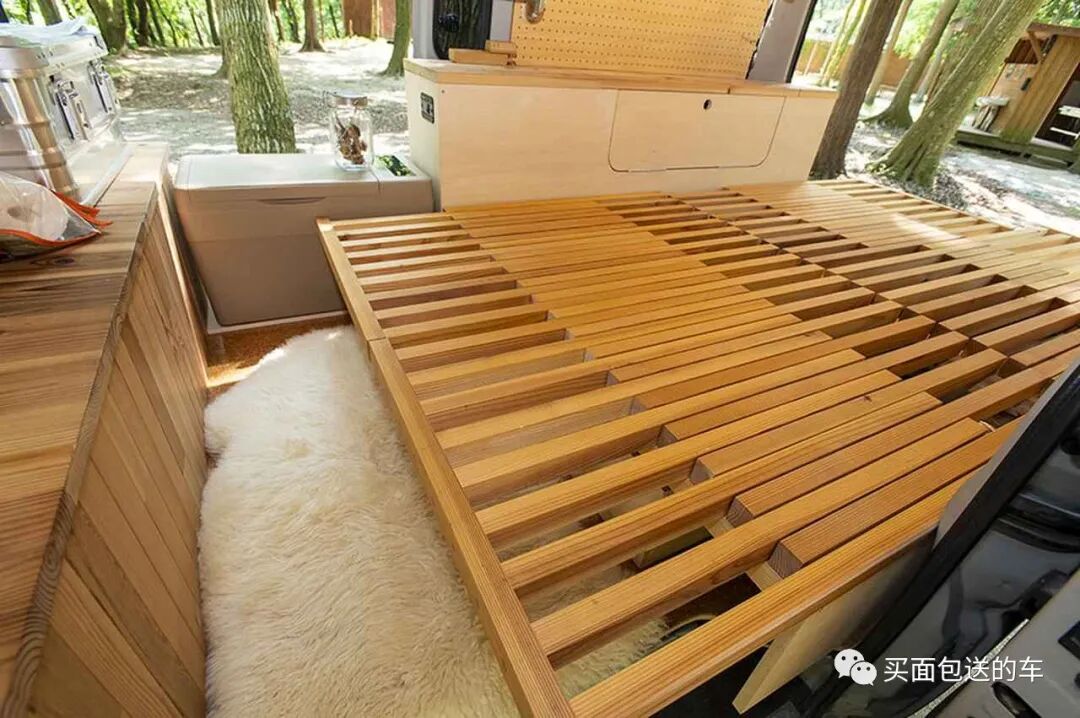 原车的后排座椅被完全拆卸,用这样的交叉木条板实现折叠座椅的功能,转换为床车模式