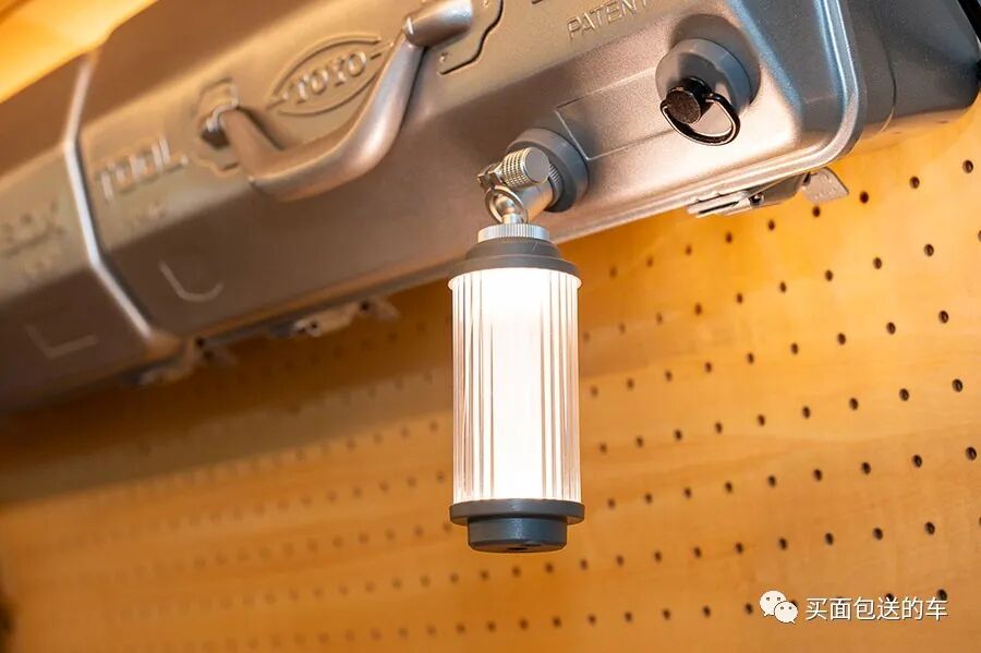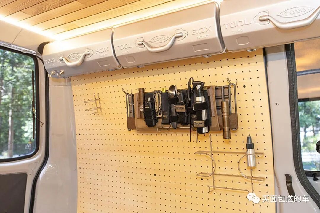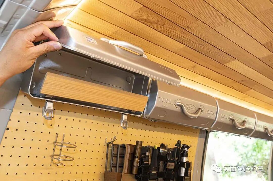 用TOYO TOOL的金属工具箱巧妙的构建了航空柜的结构,并用宜家的洞洞板制造出侧床的挂载安装板。