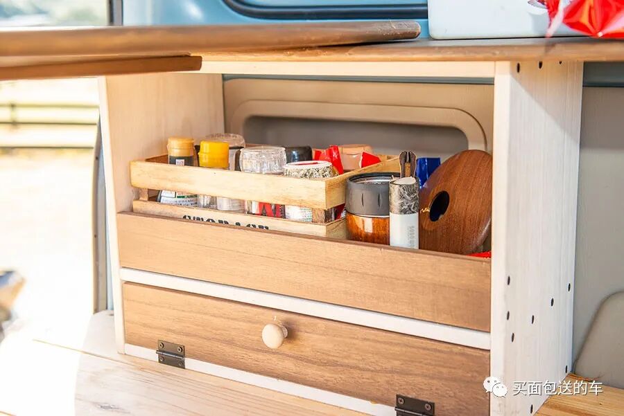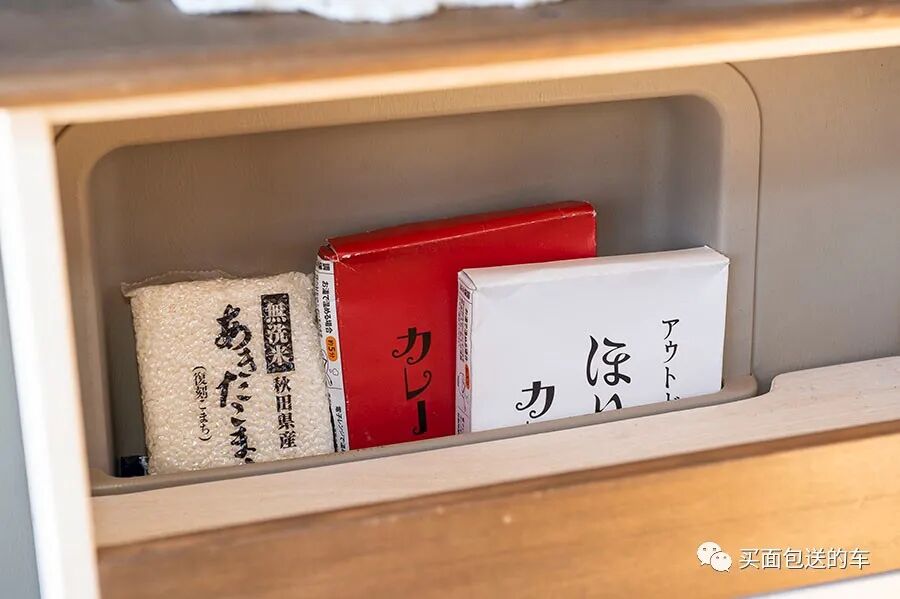 后备箱的柜体存贮了齐全的调味品,(岛国的露营文化中,除了必要水电和住宿装备,倡导最大限度收集自然食材,然后用工业化的调料进行加工,而非中国国内玩家带全套的预制食材在户外烹制)。