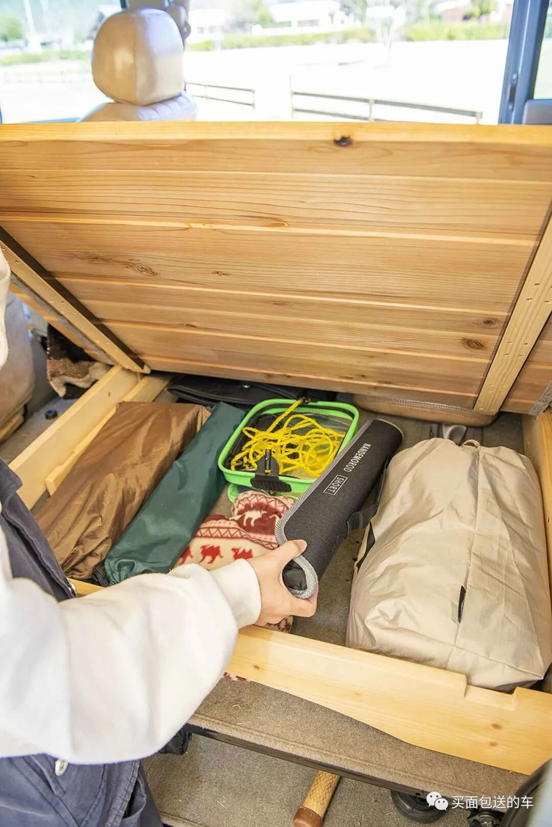 在第二排的地板上,用木柜制作的夹层储物格,主要用来存贮渔具,折叠凳和车边帐篷。