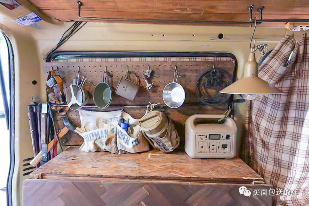 驾驶室后方是作为厨具的挂板,有着可以侧向滑出的工作台。