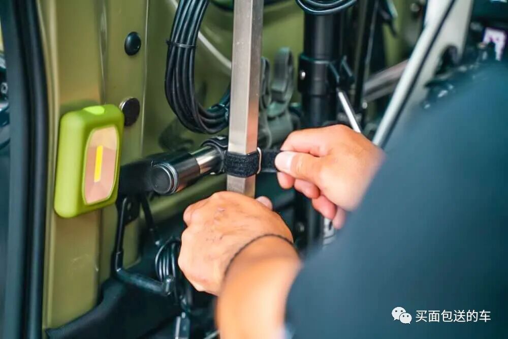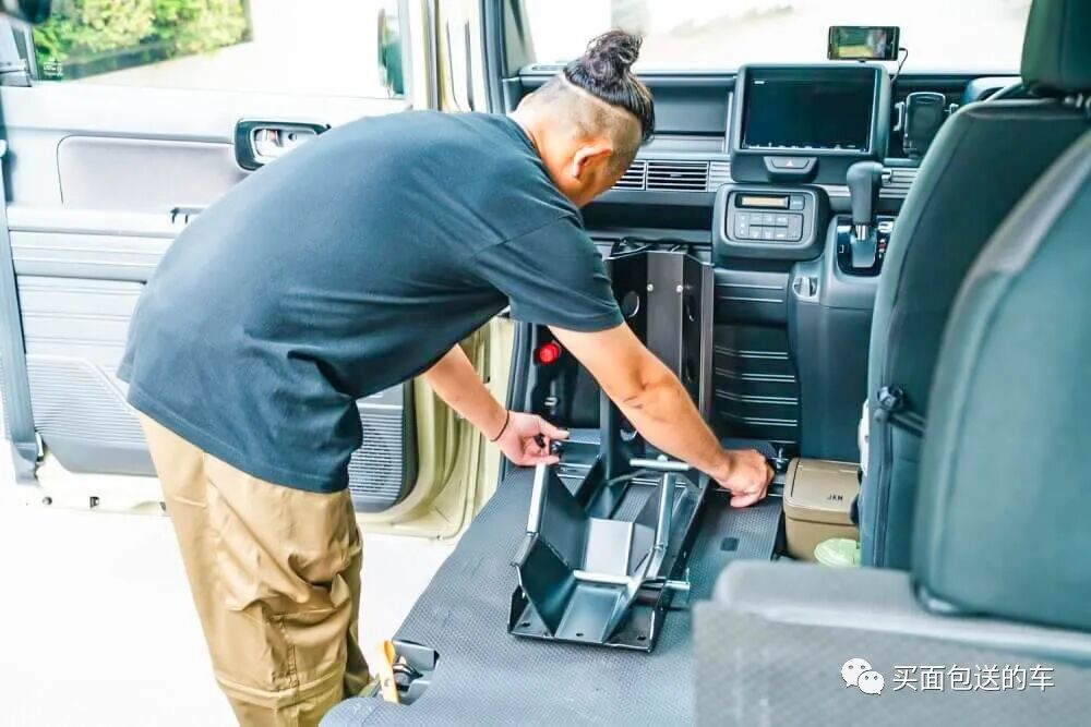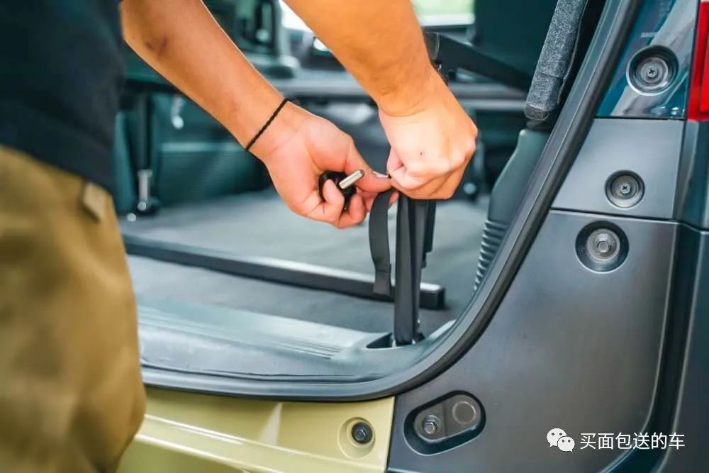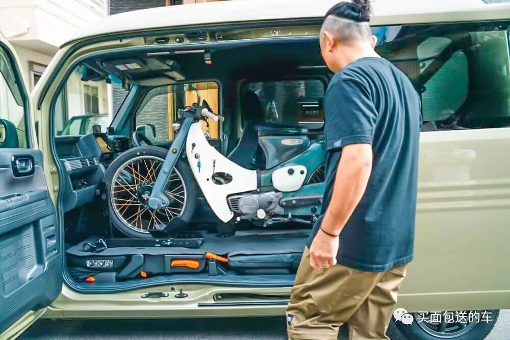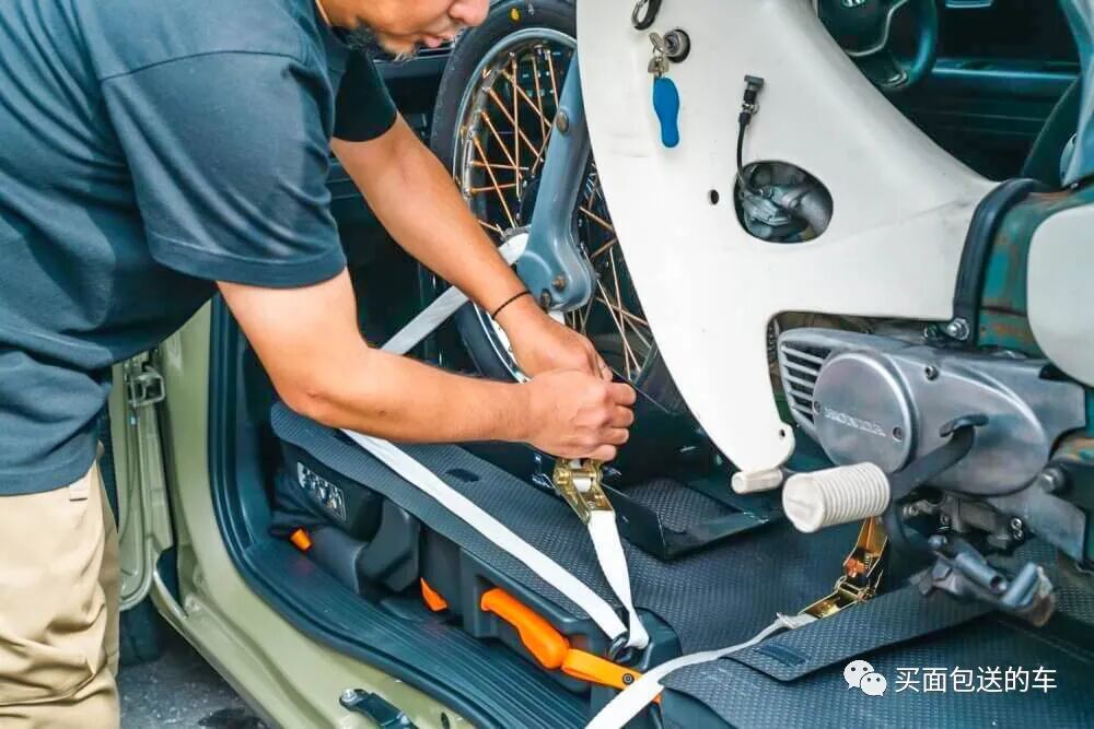 在副驾驶侧托运幼兽摩托的技巧在于固定在副驾驶靠背的摩托前轮的固定支架,金属结构并且有折叠机构。