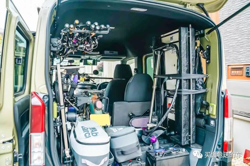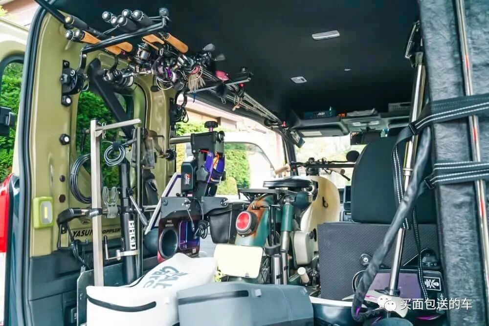钓鱼用的折叠站台,声纳探鱼器,小船用的电动外挂机都可以收纳在车内,还能满足2人的乘坐。