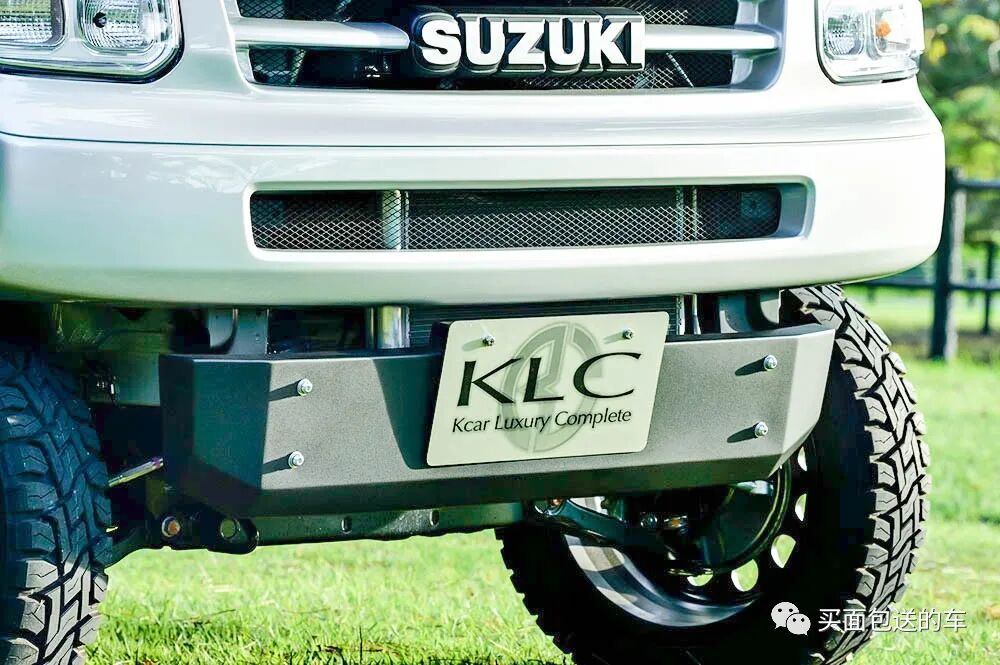 前保险杠更换为玻璃钢材料,并通过剪裁模仿了早期吉姆尼的金属前杠风格,车轮为KLC的招牌产品YAMATO复古铝合金款式。