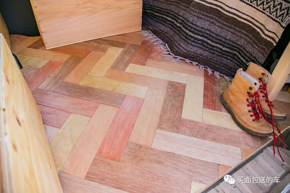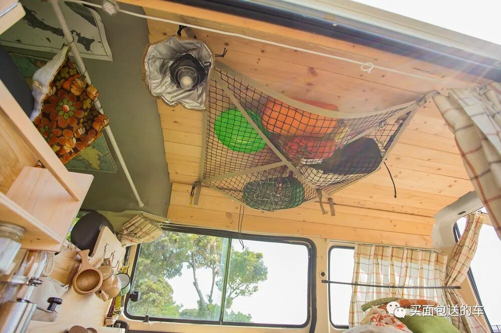 车内的配色致敬了70年代的美式CAMPING VAN的经典,棕 橙 黄 绿色之间形成了很好的协调统一。