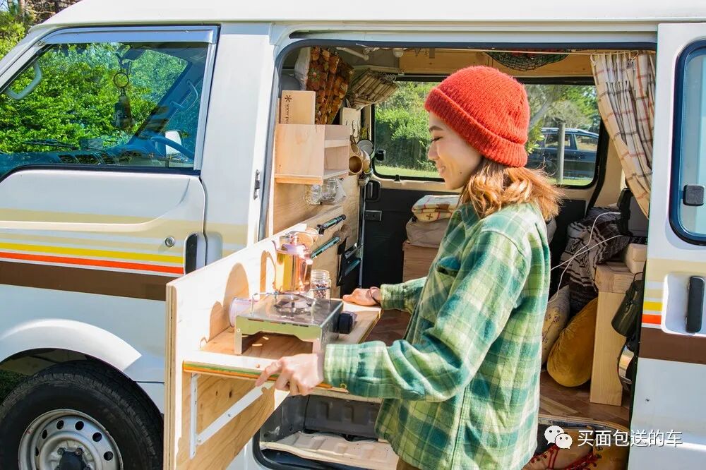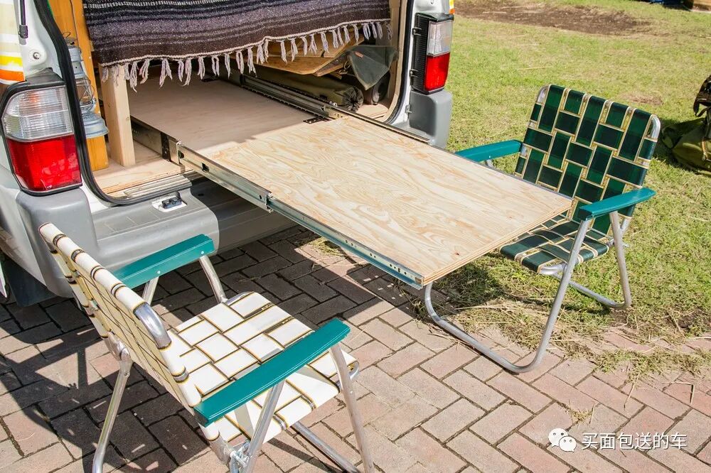 驾驶室的后背安装的胶合板,具有折叠座板和滑台机构,并收纳了简易的厨具和户外用品。