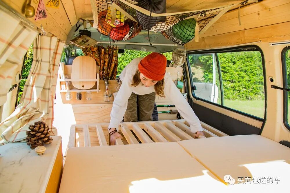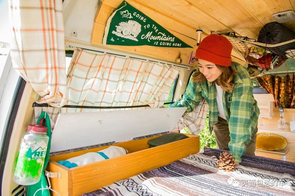 寝具备收纳在车窗侧面的木柜中,这样床板下面的空间可以被充分利用起来。
