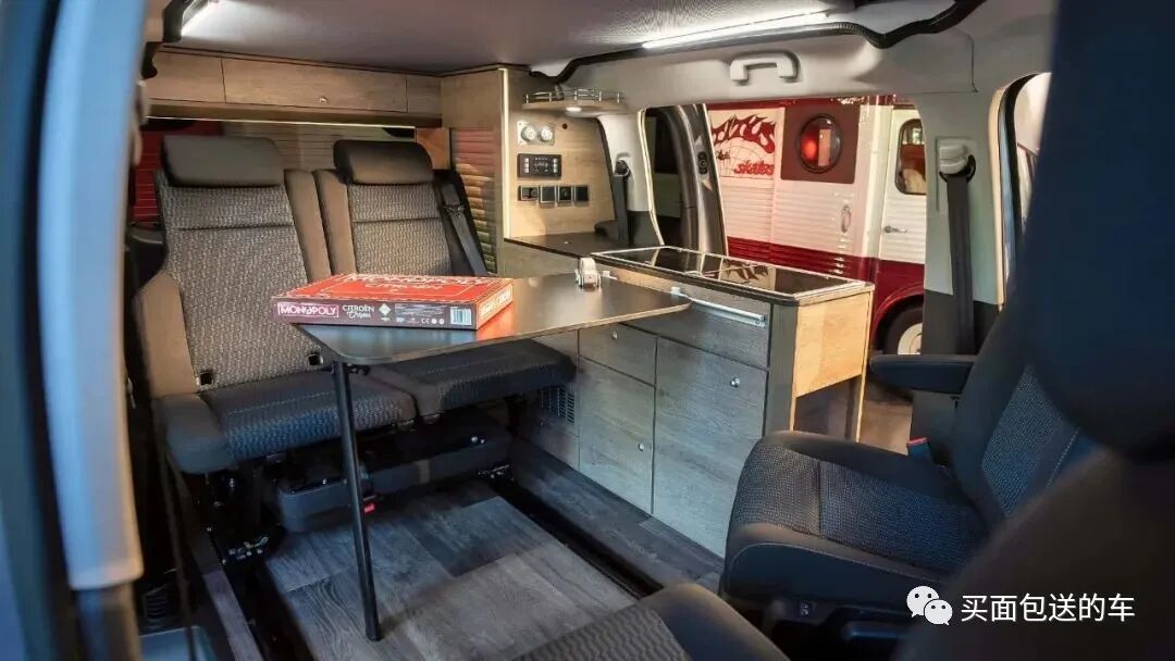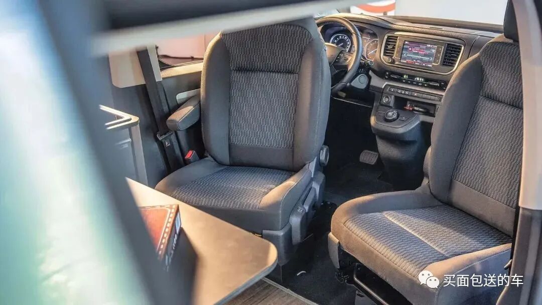 驾驶室的两个座椅可以通过旋转向后方,形成四个人对坐的客厅模式。
