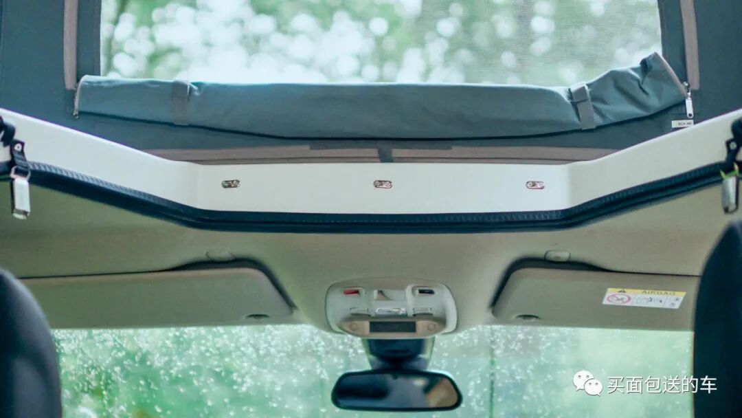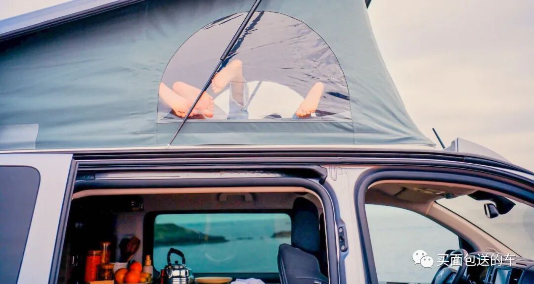原厂集成在车顶上的升顶帐篷,可以容纳2人就寝。