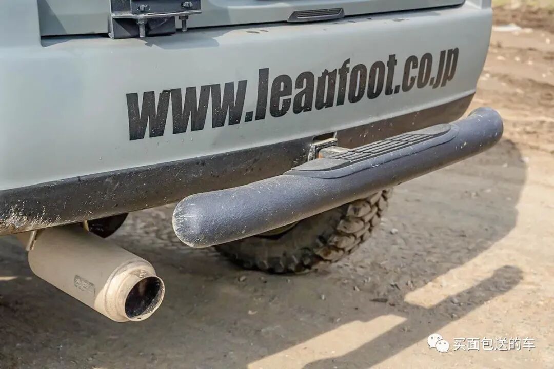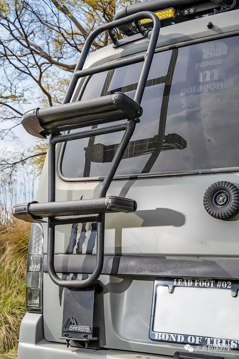 移植于第三代吉姆上的尾门梯,用加长的钣金扣件固定在尾门上,梯子上增加了滑雪板固定支架,注意车顶尾门向后照明的LED灯条。