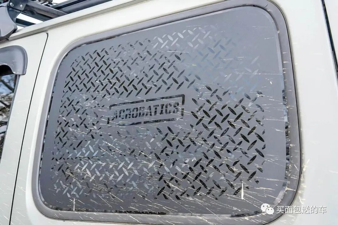 通过切割PVC广告贴纸制作的仿防滑纹车窗,增加了户外的硬派风格。