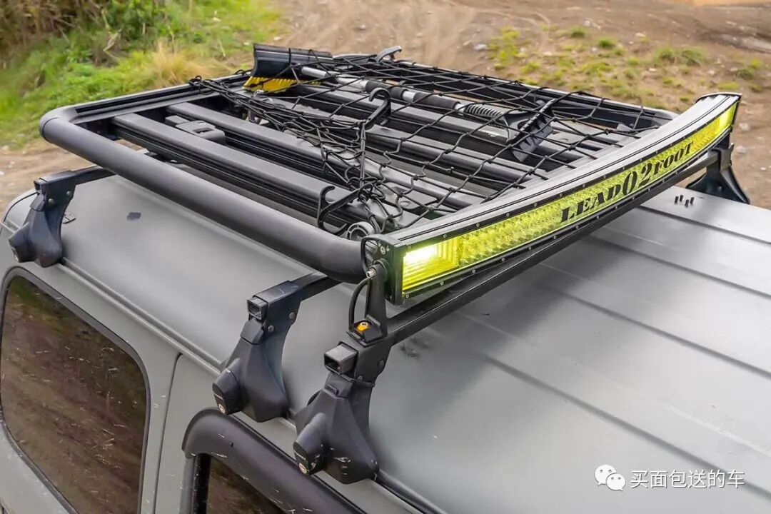 前保险杠移植于第四代吉姆尼(JB64)的原厂件,并加装了金属防护杠和LED拉力灯,在原车大灯上加装了FPR的灯眉框让线条更加立体。