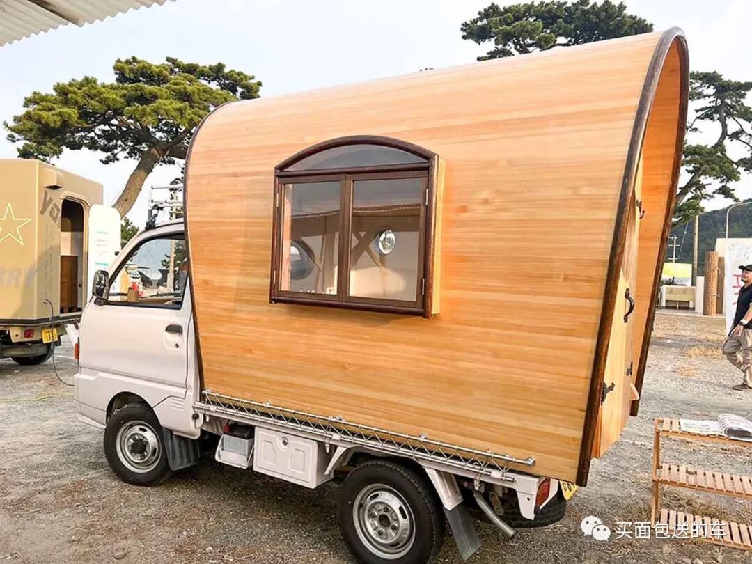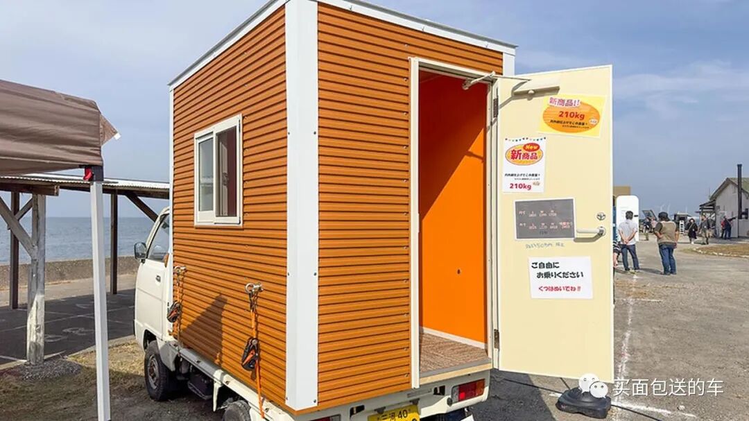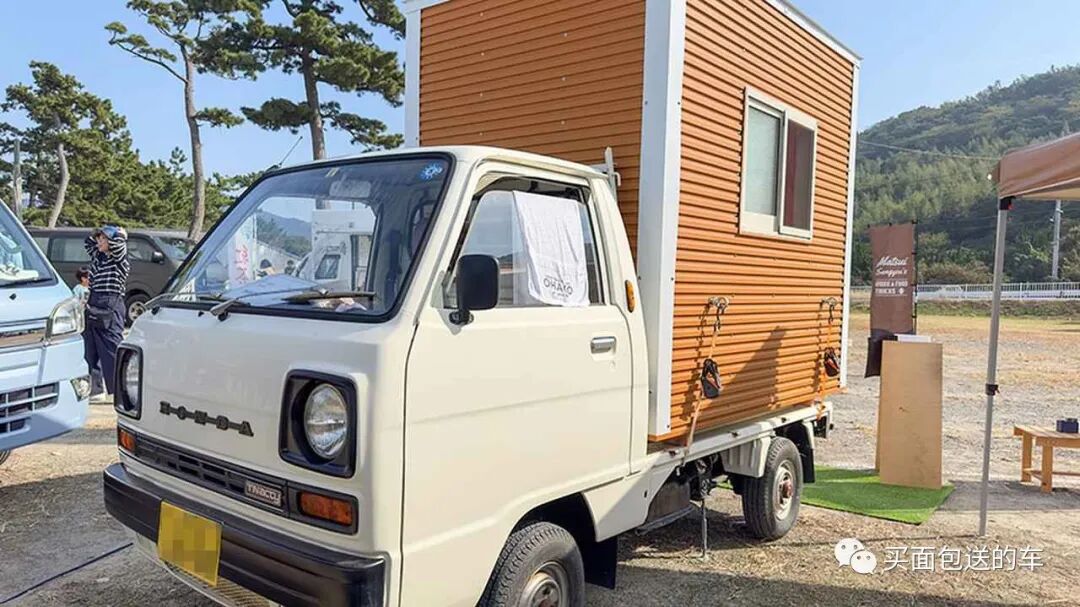 这辆老式本田轻卡的尾箱上固定了一个实木小屋模块,这是一个名为“市川建筑轻卡之家”的公司推出的OHACO系列产品。