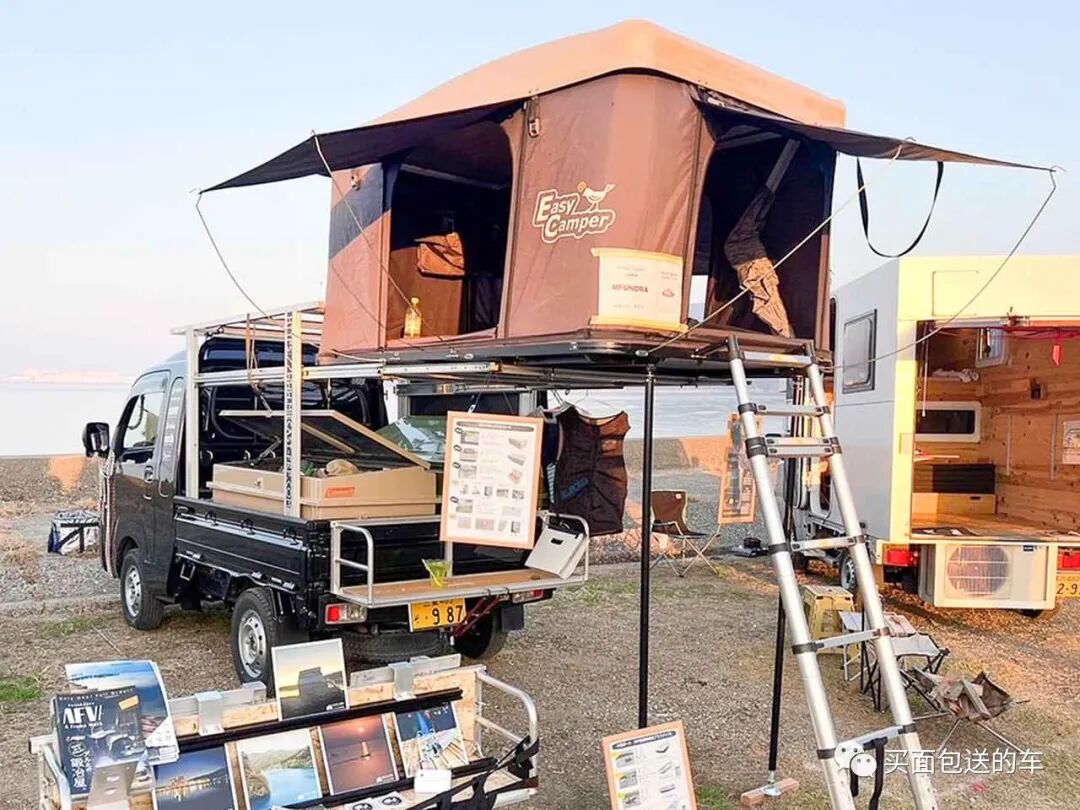 另外一辆在铃木CARRY轻卡上改造的折叠帐篷机构,采用成品的车顶帐篷通过三级滑轨向车尾后方展开成为独立的居住空间。