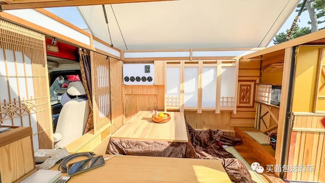 展开后的房车模块,内部装饰用精致的木工还原了日式古典风格,车顶和车侧墙开启后都融合了岛国建筑中的“借景”理念。