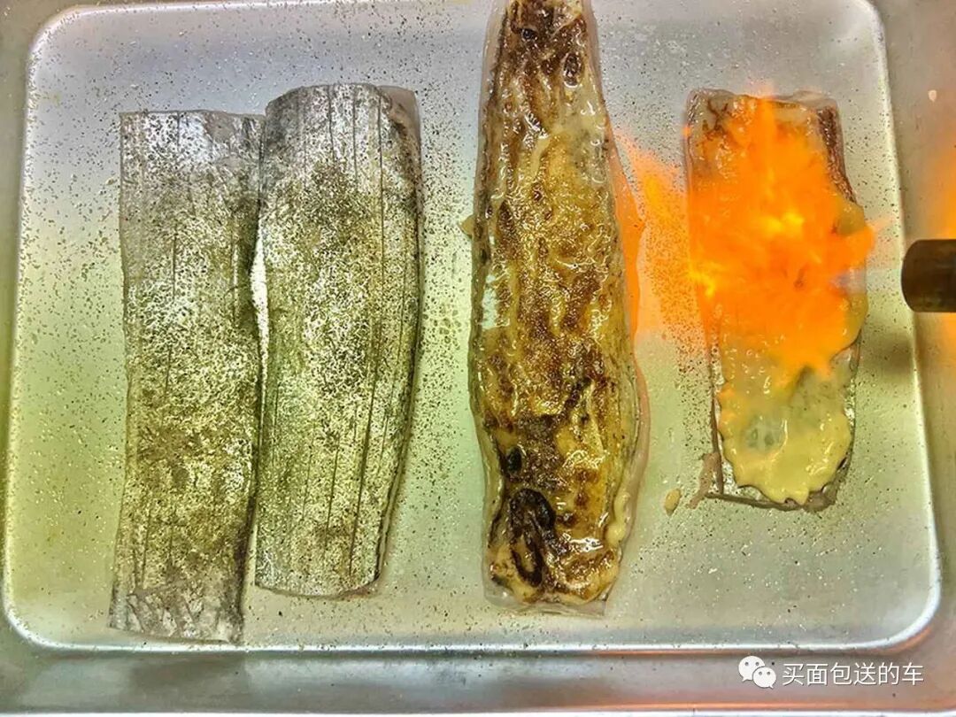 加上海盐和胡椒粉 还有色拉酱涂抹在带鱼片上,用喷火器加热烤制表面金黄。