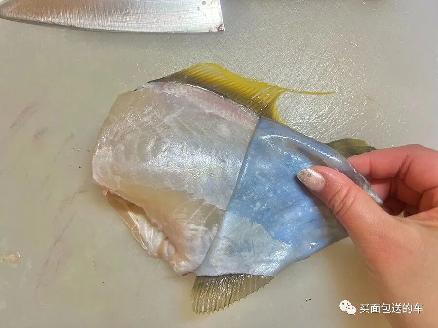 将鱼皮剥离开,鱼肉去骨后制作成生鱼片。