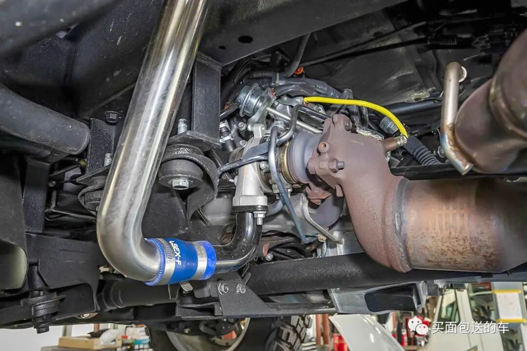 0.66L的发动机加装了IHI涡轮增压器与加大的三元催化器,注意黄色的线缆部分为前氧传感器。