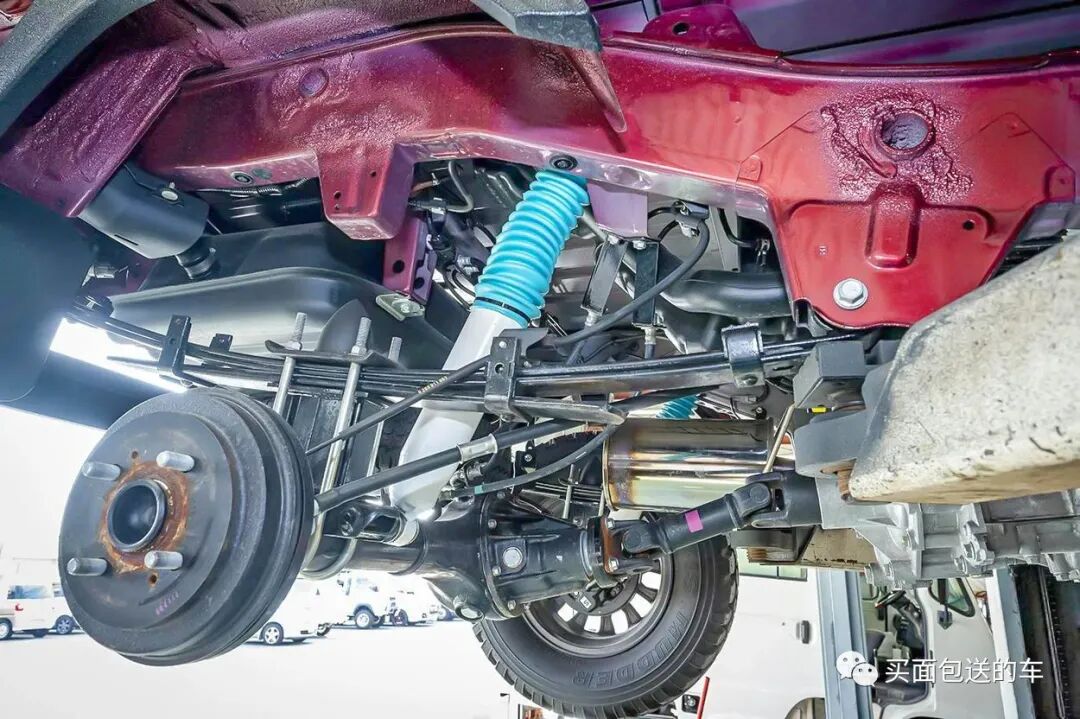 对于有独立车架的轻卡,提升底盘高度非常简单粗暴,在后钢板弹簧与后轮桥之间加入钢制垫块,并更换加长的减震器即可。
