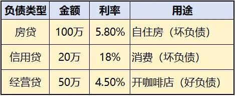 坏负债:用于消费或购买贬值品(如自住房按揭贷款、车贷、信用卡透支)。